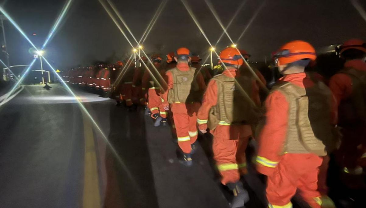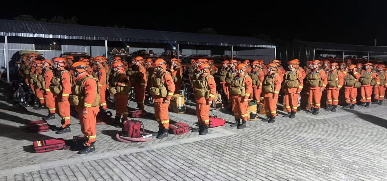 起身、穿衣、蹬靴、携装、集结,整套动作一气呵成,全体消防员闻令而动,短短数分钟内,队员们便全副武装、整齐列队,嘹亮的口号在营区的夜空久久回荡。尽管白天训练的疲惫尚未消散,但所有人仍咬紧牙关、步伐铿锵,紧跟队伍完成后续战术衔接演练,用行动接受体能与意志的双重考验。