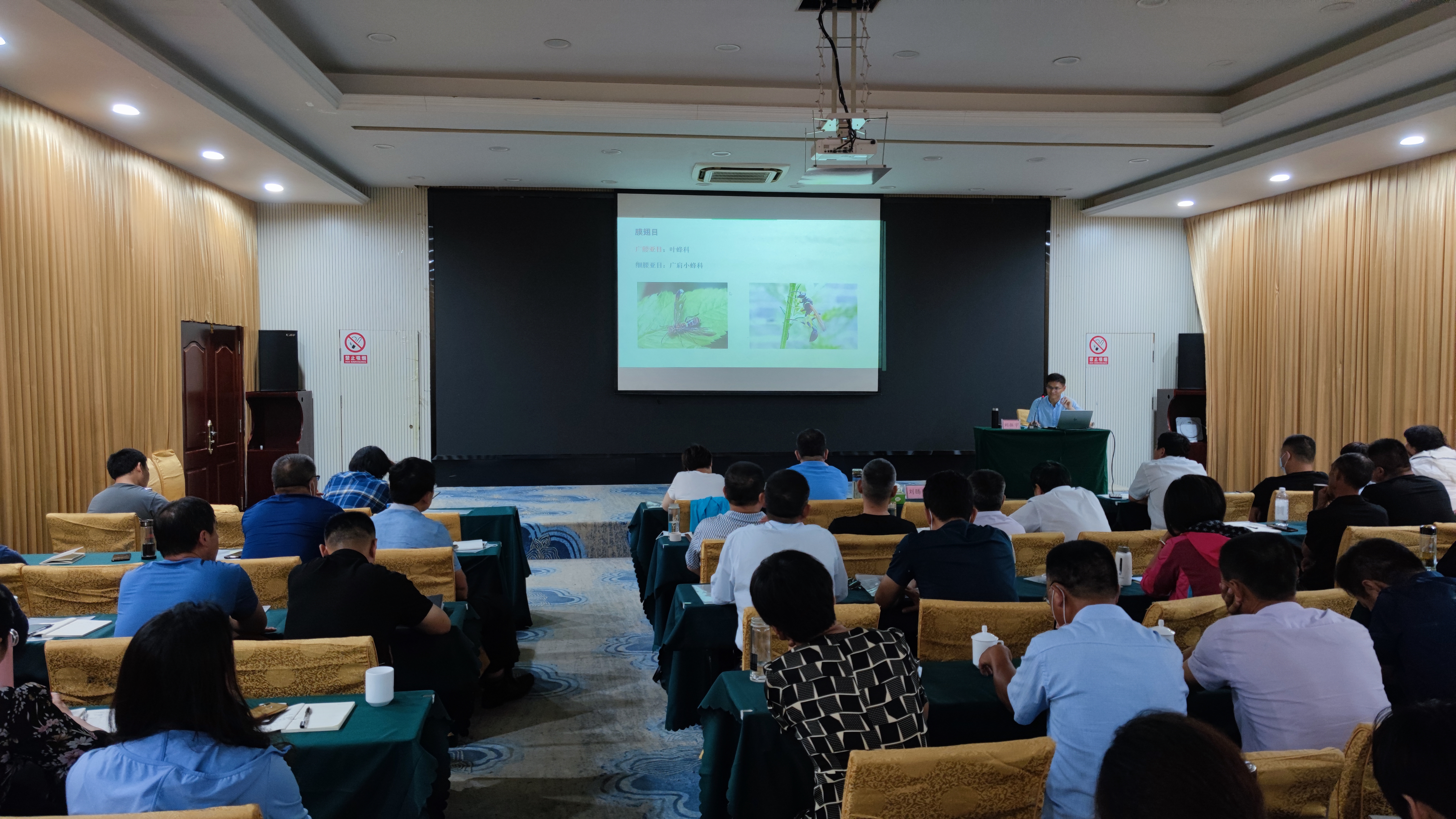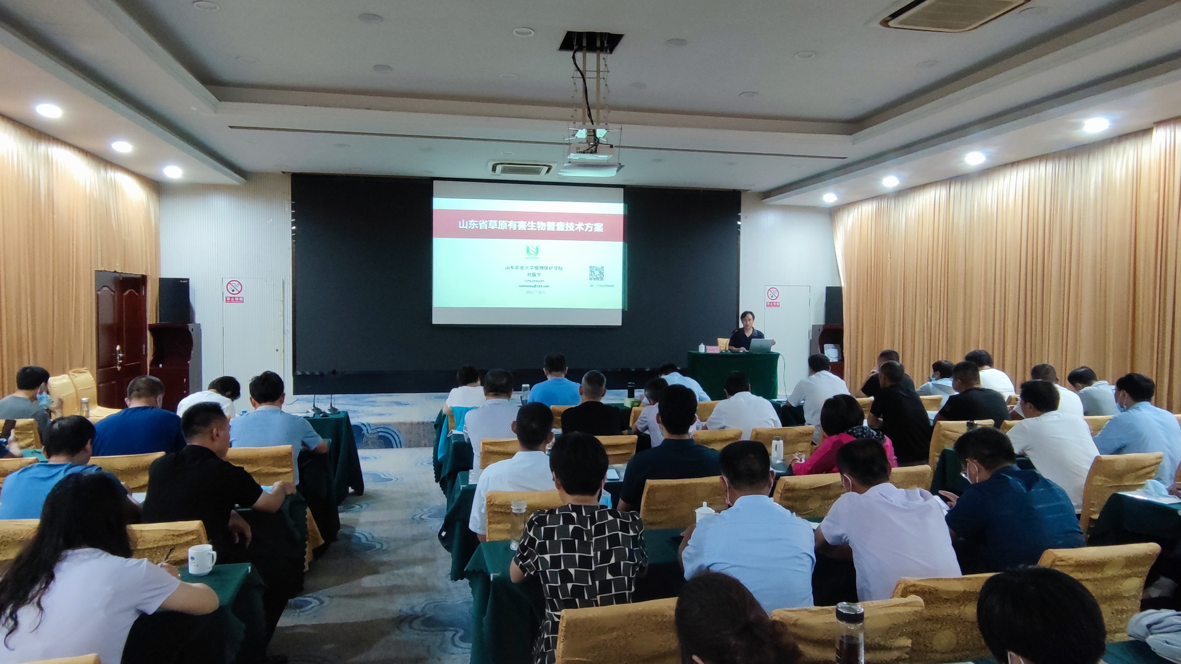 培训班上,山东农业大学植物保护学院教授、博士生导师刘振宇讲授了山东省草原有害生物普查方案和技术,围绕普查目的和要求,普查范围、对象和内容,草原病害调查方法,标本制作和影像拍摄,内业整理以及成果与材料报送等方面进行了重点讲解。特别对草原植物病害踏查技术、病害诊断、病害标本采集制作、保存技术、草原病害影像采集技术进行了详细讲解。山东师范大学生命科学学院副教授、硕士生导师刘腾腾重点讲解了草原有害生物普查系统APP操作流程、昆虫标本采集及制作和长林小蠹普查技术。主要介绍了辅助点采集、线路踏查、标准地调查以及采集标本等具体操作规范,并对系统里面的草原类型、虫害种类分类标准、草原虫害普查方法、昆虫标本制作以及标准地设置等具体细节作了详细讲解。